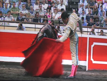 En la suerte contraria, estocada entera que es aplaudida. El toro se va a las tablas, las barbea y finalmente cae sin puntilla en muerte espectacular.