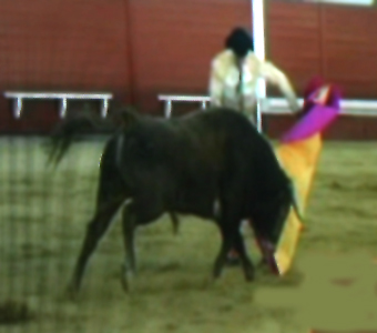 El toro galopando va a por el torero que lo vacía por arriba. Tres muletazos por arriba, en el último de los cuales el toro mide el suelo.