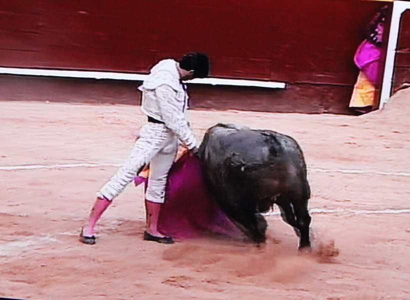Muleta en la mano diestra dispuesto a torear al redondo a un toro que no humilla y quiere coger por el pitón derecho. Serie de redondos angustiosos que remata con un pase de pecho sobre la derecha más angustioso aún puesto que está a punto de ser cogido el matador salmantino.