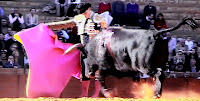 Muleta en la mano izquierda. Buenos naturales en los que ha de perder tres pasos ante el acoso del novillo. Remate con el de pecho sobre la mano izquierda momento en que el novillo le levanta las zapatillas del suelo. Continúa muy valiente con la muleta sobre la izquierda. Dos buenos naturales que remata con el de pecho sobre la derecha.