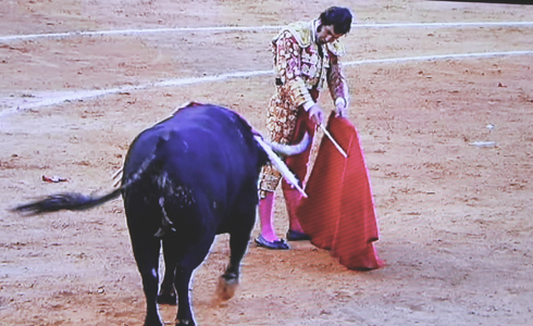 Con la muleta portada en la mano derecha se vuelve a aproximar al toro. Muletazo al redondo de rodillas flexionadas. Remata con el de pecho sobre la mano derecha. Excelentes derechazos citando al toro de frente en medio de los pitones. Remata con un adorno en el que toca el pitón del toro y recibe una enorme ovación.
