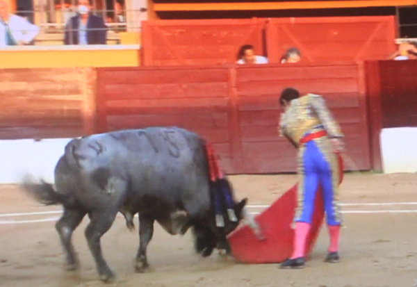 mano derecha a un toro que está distraído en el burladero de matadores. Lo