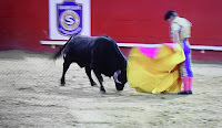 Un pase de pecho sobre la mano derecha en el que el toro en el remate hace amago de irse. Un redondo en el que el toro no se emplea. Sigue el toreo al redondo metido materialmente entre los pitones. Dos excelentes redondos acoplándose perfectamente a la embestida del toro.